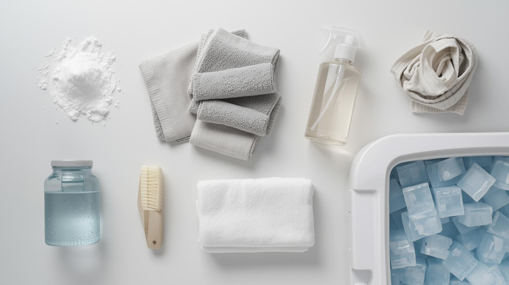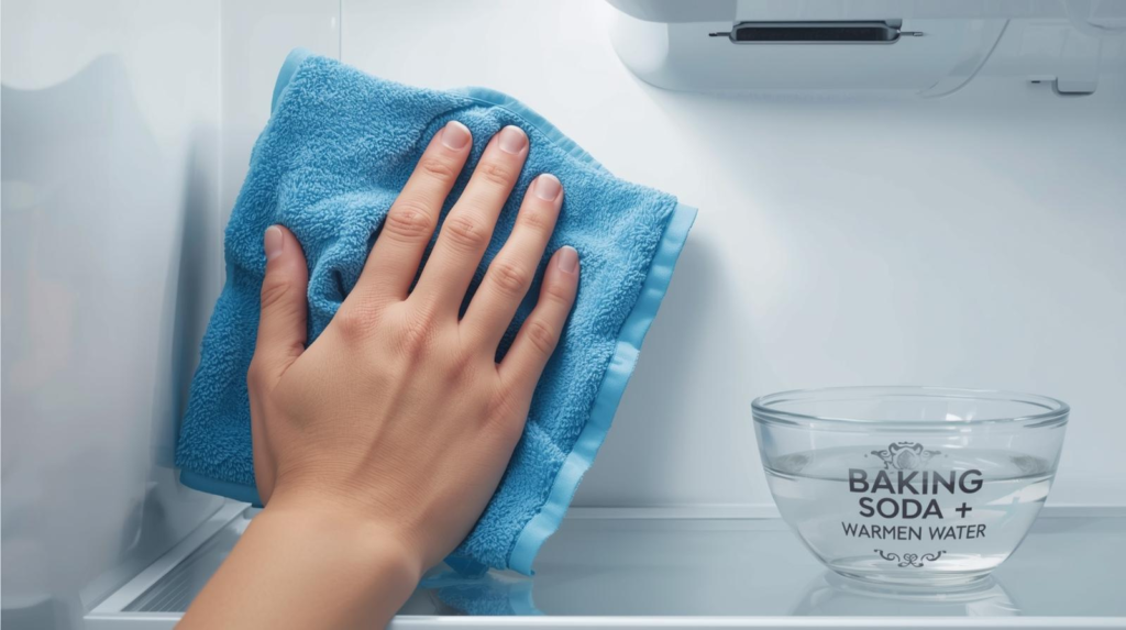 Make a mild cleaner: baking soda + warm water (widely recommended by extension programs for deodorizing fridge interiors) — for example North Carolina Cooperative Extension (NC State Extension) and Penn State Extension (Penn State Extension) recommend baking soda solutions for odor control/cleaning. Wipe walls, ceiling, floor, door shelves, rails, and corners.
