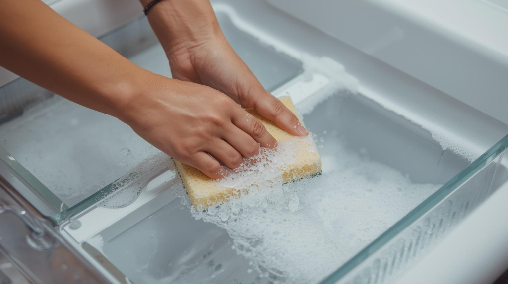 Pull out removable bins, drawers, and shelves; wash them with warm water + dish soap, rinse, and dry completely. (Drying matters because trapped moisture can hold odors and grime.)