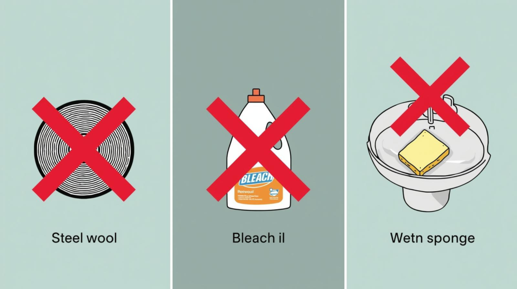 - Steel wool / carbon-steel brushes, because they can leave iron particles that later rust and stain stainless steel—called out by SSINA and reinforced by Kohler.