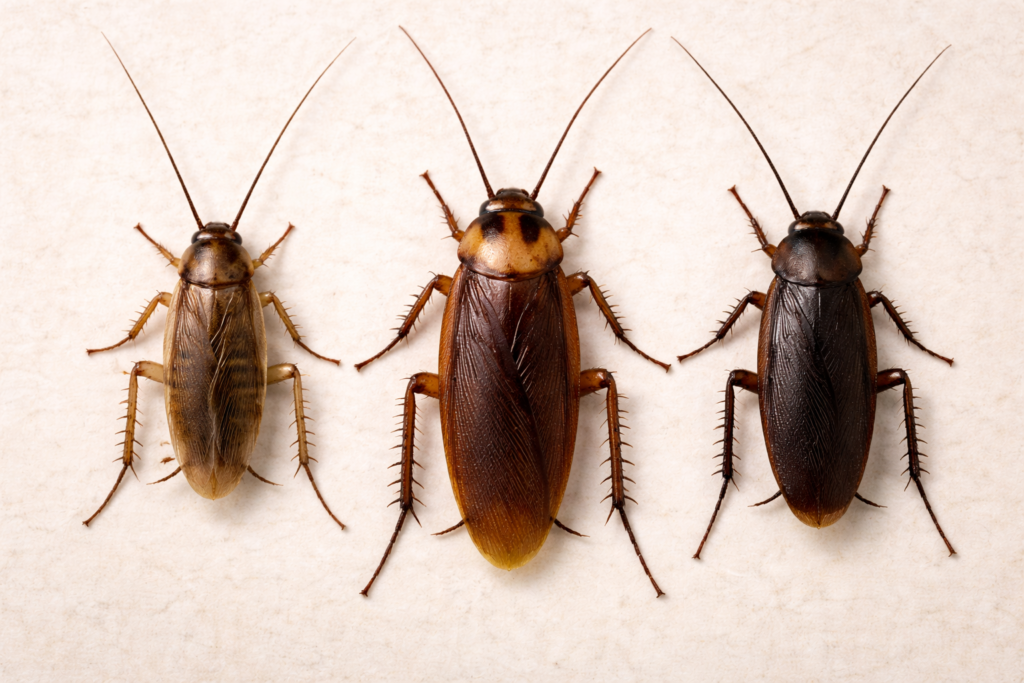 Most indoor infestations are German cockroaches (small, tan, often with two dark stripes behind the head). Larger roaches (like American or smokybrown) may indicate moisture or entry from outdoors/sewers rather than a breeding population in your cabinets. (NC State Extension)
