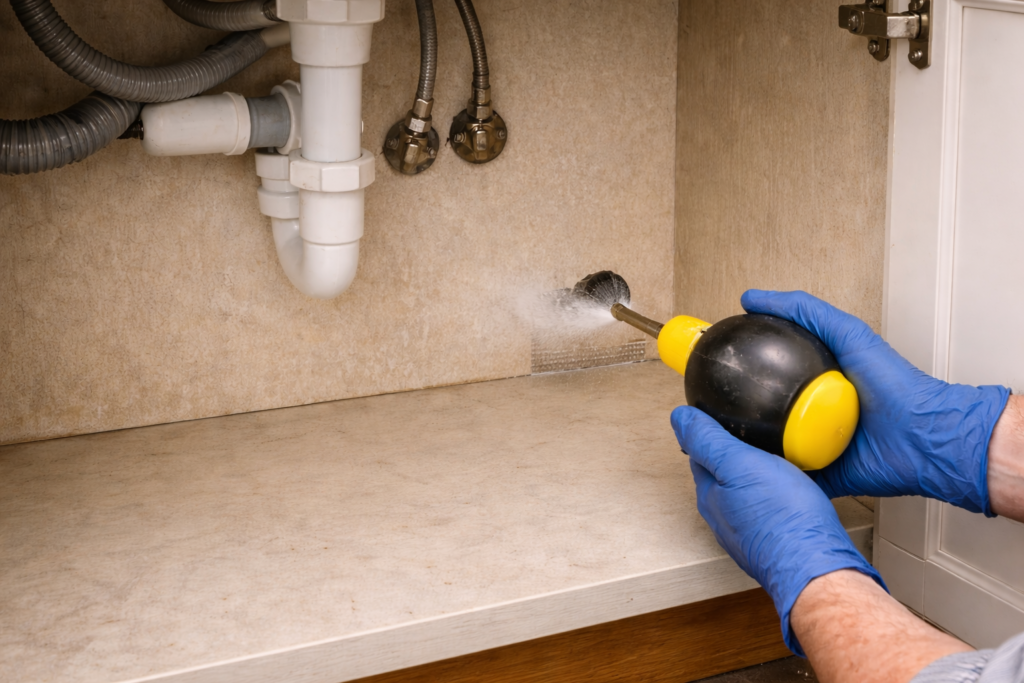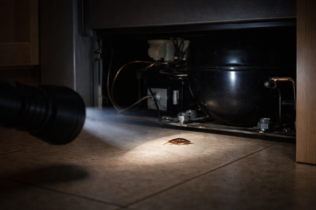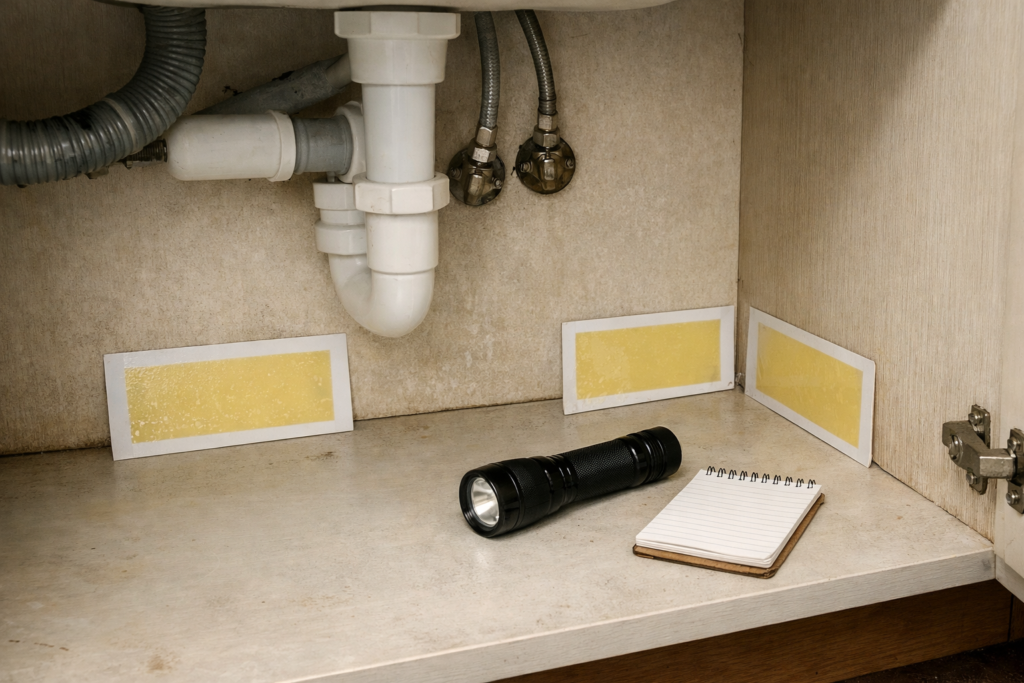 - Do a quick night check (kitchen and bathrooms first) with a flashlight—look under sinks, behind the fridge, around the dishwasher, and inside cabinet hinges. (NC State Extension)