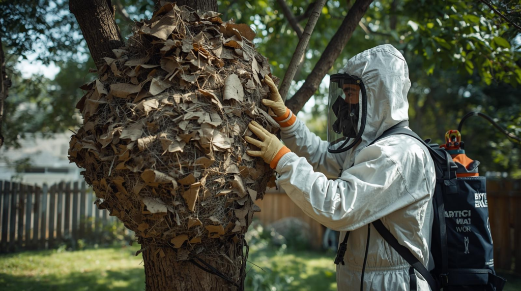 Large enclosed paper nests (often called hornet-type nests) can contain many defensive workers, and removal often involves height and protective equipment. Extension guidance frequently recommends avoiding disturbance and using professional help when a nest is in a conflict area (safety framing: UMD Extension; general “don’t disturb nests” guidance: UC IPM).