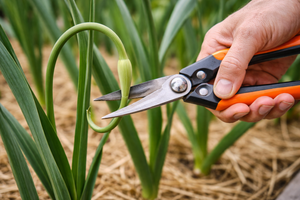 Hardneck garlic sends up a curly stalk called a scape. Removing scapes shortly after they curl is commonly recommended so the plant puts more energy into the bulb, and scapes are excellent to eat. (University of Minnesota Extension) Ohio State Extension also notes scapes should be removed for better bulb size. (Ohioline)