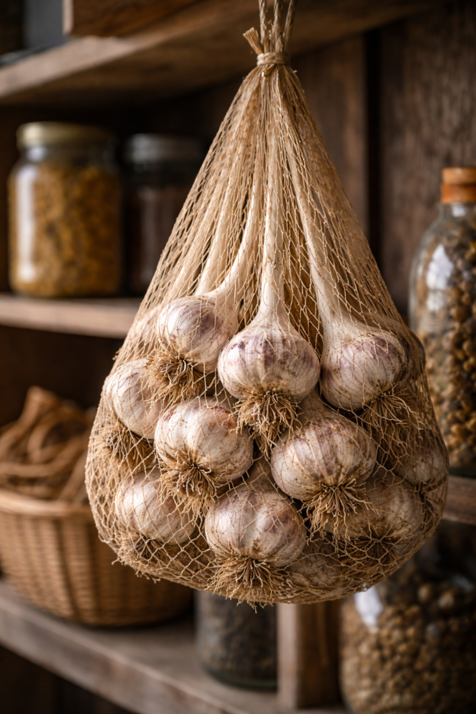 Garlic stores best with airflow—think mesh bags, slatted crates, or braids—not sealed plastic. (OSU Extension Service)