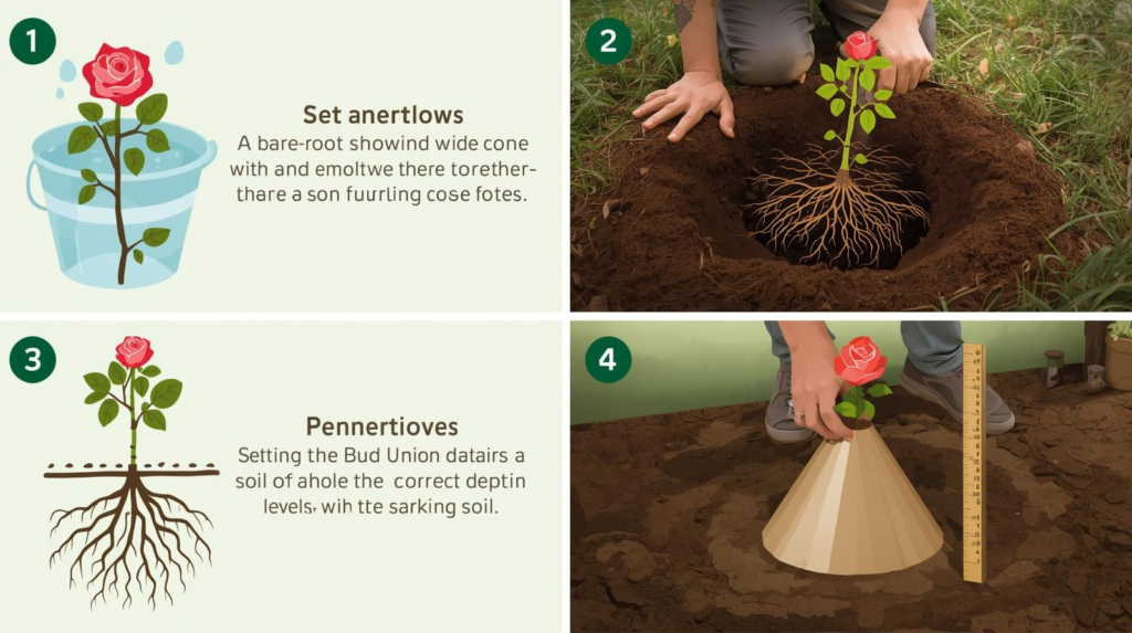 - Set the bud union at the correct depth (this is the part that varies by climate):
