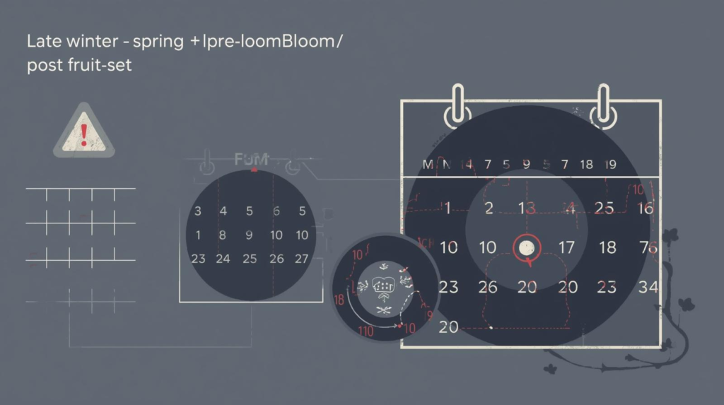 - Best window: just before bloom or just after fruit set (often late winter through spring in many climates). This timing is recommended in UC guidance and helps the tree adjust its fruit load. (UC IPM)