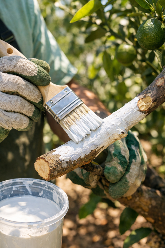 After pruning, citrus bark that suddenly gets full sun can sunburn (sunscald). UC guidance recommends protecting exposed limbs by painting with a 50:50 mix of white interior latex paint and water. (UC IPM)