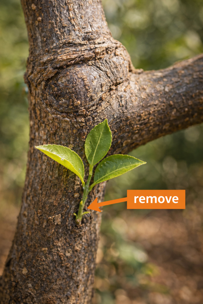 Step 1: Remove rootstock suckers (below the graft)