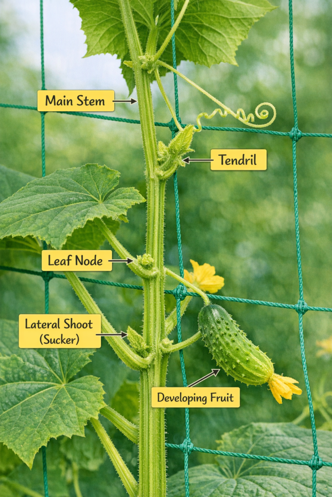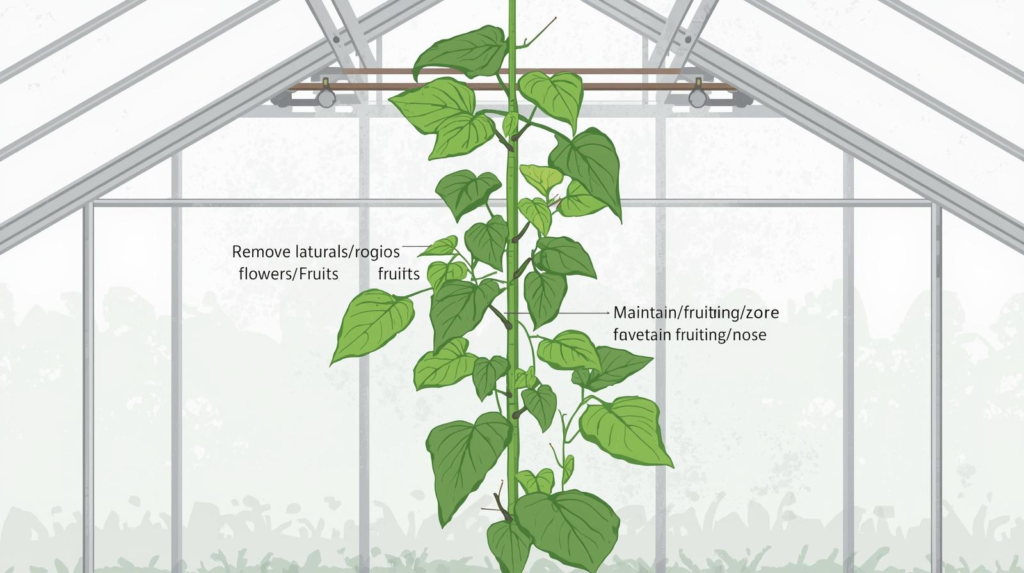 Protected-culture cucumbers are often trained to a leader with intentional rules (especially for seedless/parthenocarpic types).