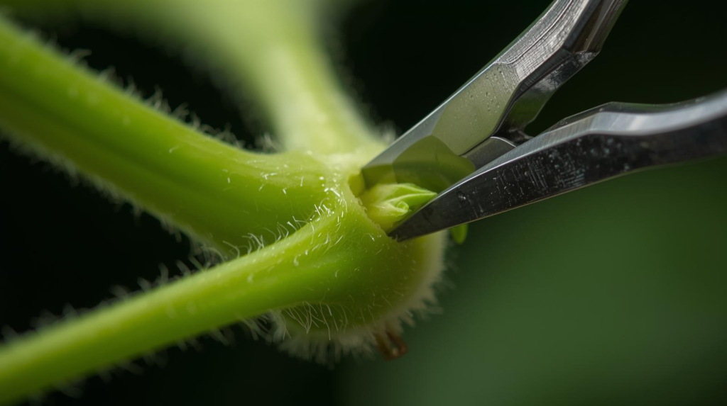 Keep the strongest central vine; remove most laterals as they appear (especially if space is tight or disease pressure is high). This matches common “single leader” trellis strategies described by UMN and Rutgers for higher-airflow systems. (UMN Extension, Rutgers PDF)