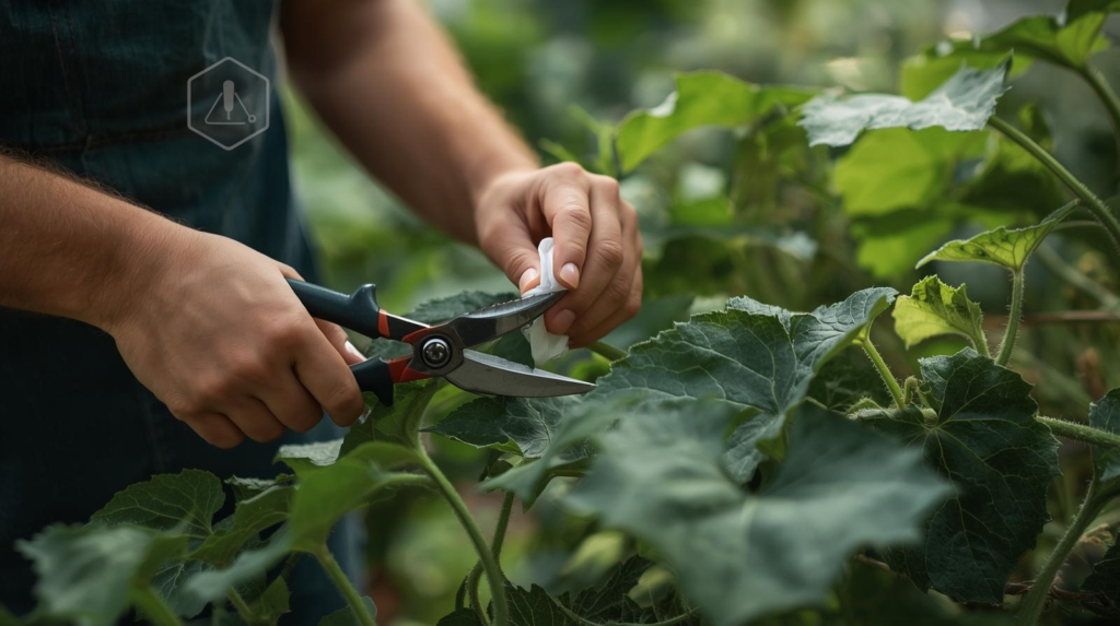 If you’re working in a patch that has bacterial/viral issues, minimize unnecessary handling. Guidance for trellised cucumbers notes that handling during trellising/pruning can spread some bacterial and viral diseases, so it’s smart to prune when foliage is dry and keep tools clean if disease is suspected. (NCSU trellised cucumber leaflet PDF,Rutgers PDF)