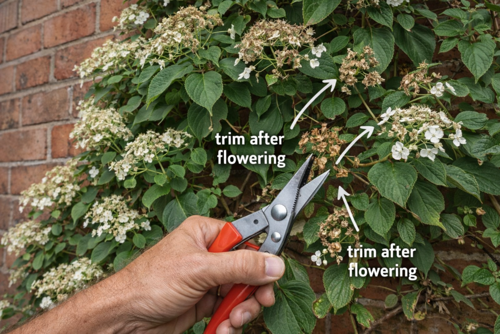Climbing hydrangeas produce flowers on last year’s shoots, so routine pruning is recommended in summer straight after flowering to preserve next year’s flowering wood. That timing and method are laid out in the RHS climbing hydrangea growing guide and reinforced by the “after flowering (summer)” schedule in N.C. Cooperative Extension’s species chart.