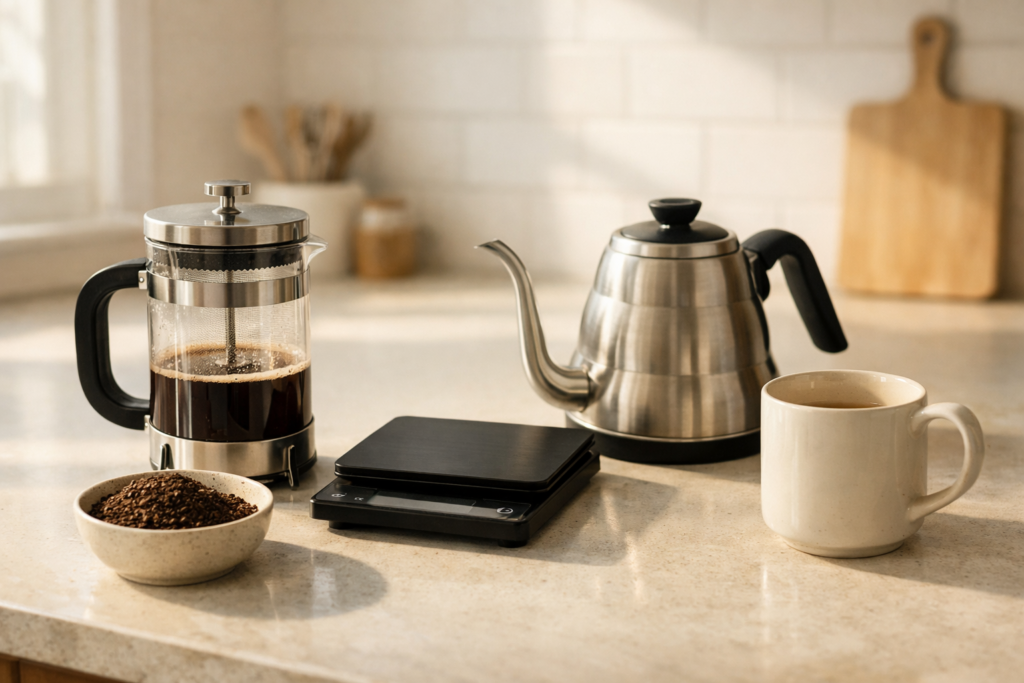 These “quick numbers” align with the National Coffee Association’s French press quick ratios, temperature, and time and are consistent with recipes from PT’s Coffee (1:15, 4 minutes, 195–200°F) and ESPRO (195–205°F and up to 4 minutes).