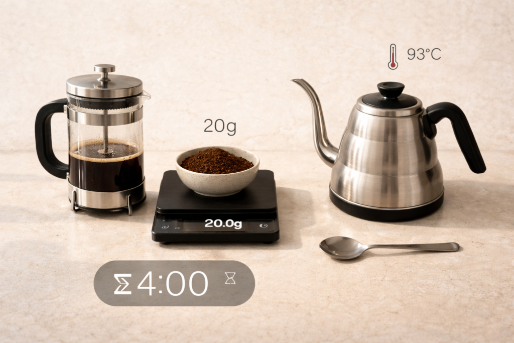 Start with coarse grounds, ~90–96°C / 195–205°F water, and a 4-minute steep at about 1:15, then plunge slowly and pour immediately. Those targets are consistent across the National Coffee Association’s French press guide and respected brew guides from Stumptown, PT’s Coffee, and ESPRO.