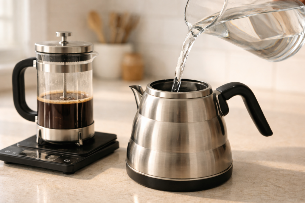 Use cold water (filtered if you can) and avoid distilled or softened water, because minerals in water influence extraction and flavor. This guidance appears directly in the NCA’s French press recommendations, and the Specialty Coffee Association explains how dissolved minerals affect extraction and taste (including why mineral-free water behaves differently).