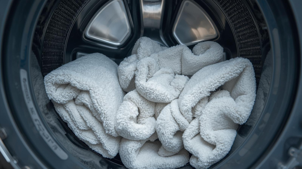 Cycle tip: A normal/cotton cycle is usually fine; use “heavy duty” only for very dirty towels so you don’t prematurely wear fibers. (Cleaning Institute)